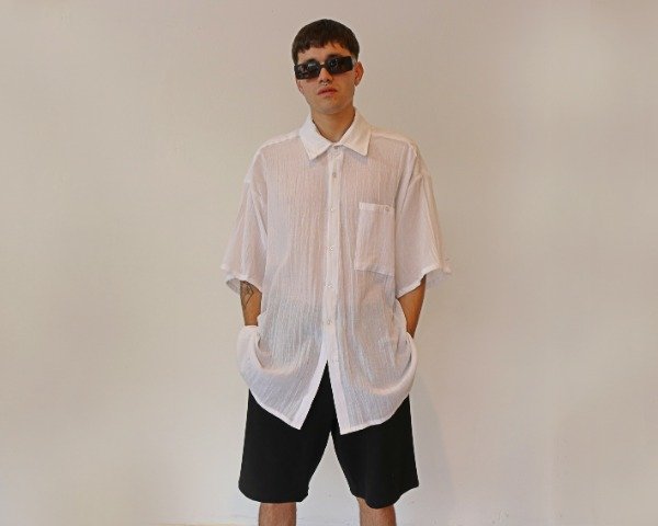 Camisa larga recta manga corta realizada en en gasa de algodón efecto arrugadito.