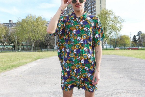 Camisa larga recta manga corta realizada en Fibrana estampada.